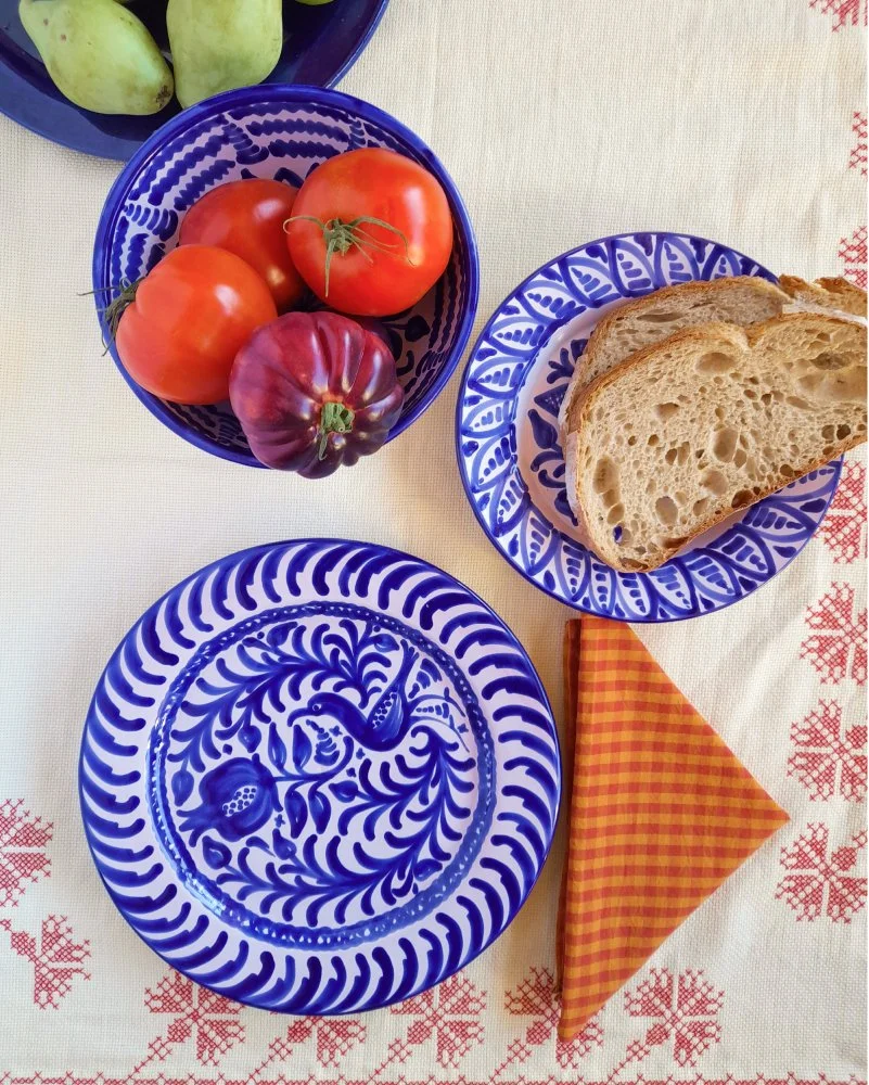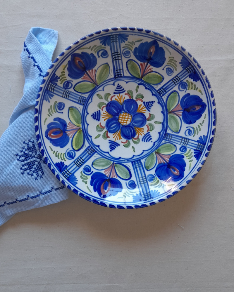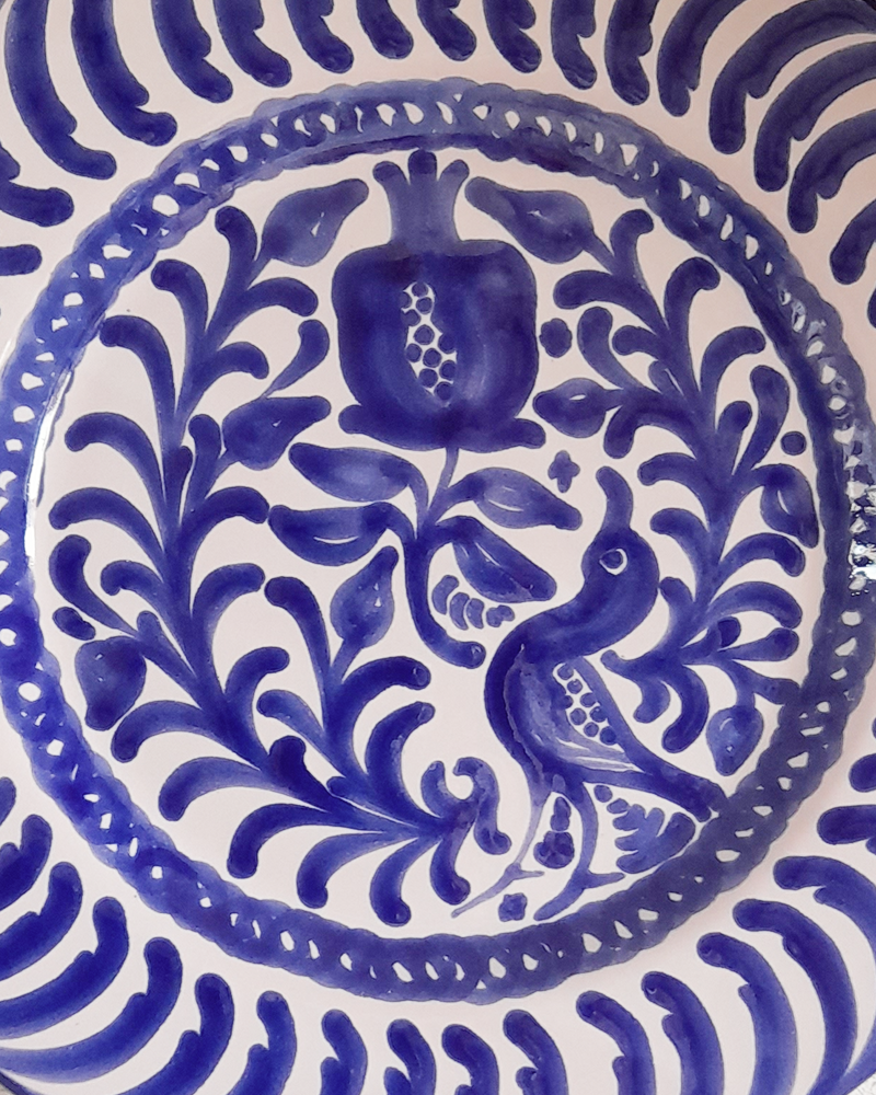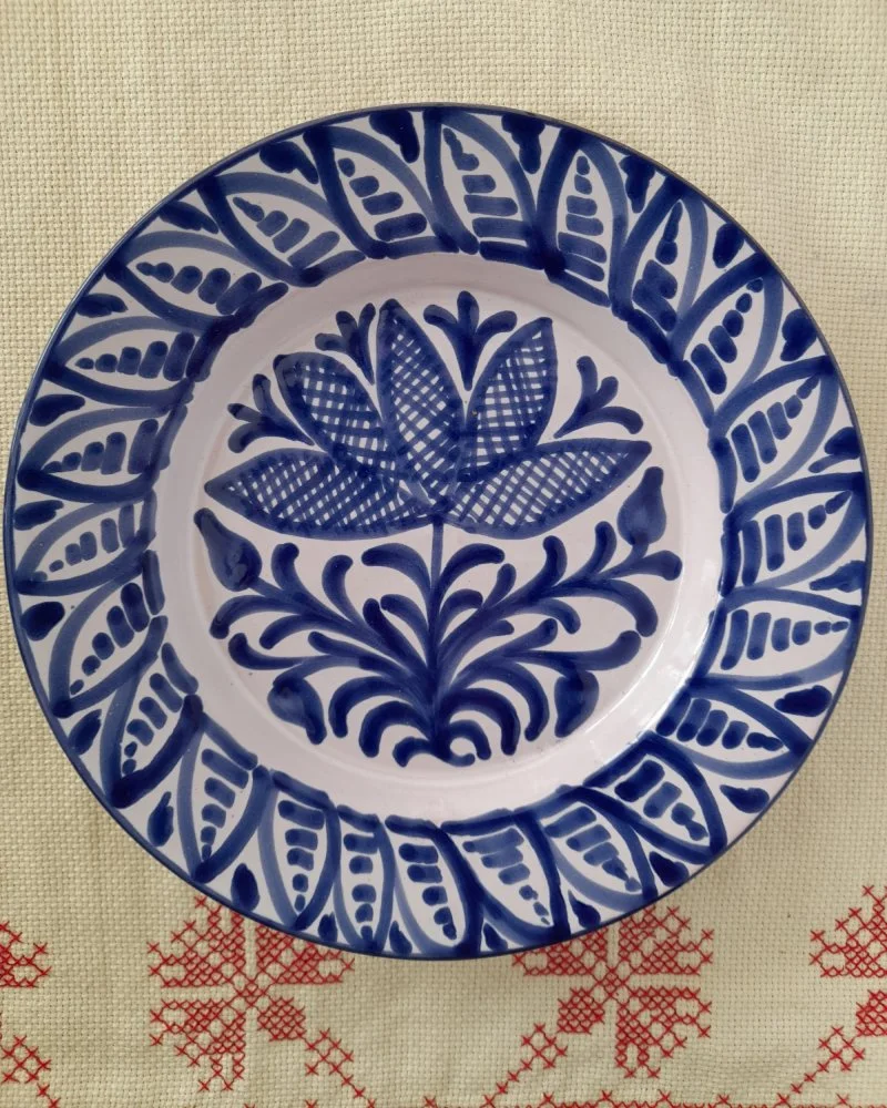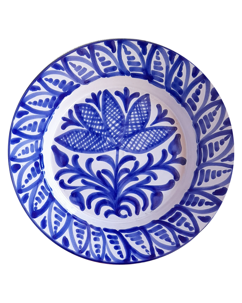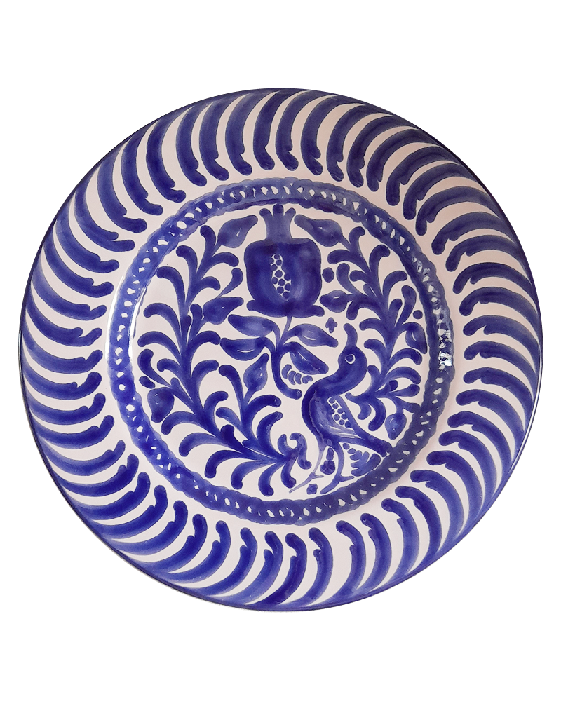 This charming Palmilla Fajalauza ceramic plate features a decorated pattern that mimics the date palms common across southern Spain. Painted by hand in our traditional copper green, this motif shines in contrast to the white glazed surface of the plate.