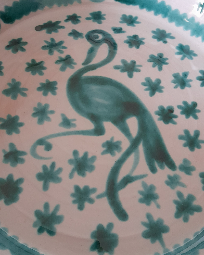 This green Flamenco Fajalauza Plate features motifs from its native Andalusian landscape. A sprightly flamingo prances against a starry backdrop that recalls the night sky. The wide rim of the plage features a pattern of overlapping arches that run above equidistant torretas, a motif that looks like small towers.